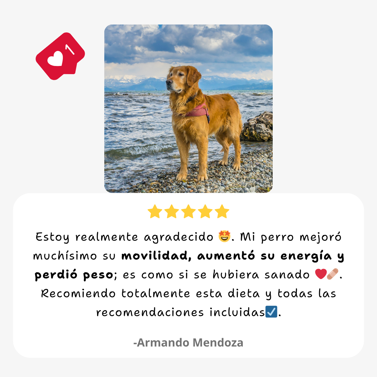 La Dieta de Soporte Articular es un producto digital en PDF que ofrece una dieta diaria natural, completa y formulada bajo los estándares de la AAFCO para perros adultos que necesitan apoyo en articulaciones y movilidad.